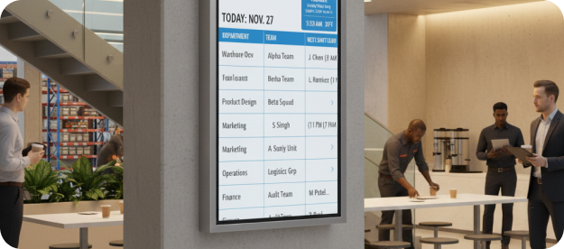 Deliver shift updates, service changes, HR notices, dashboards, and internal reminders across screens.